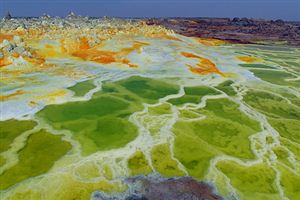 บางทีสถานที่แห่งนี้น่าจะเป็นสถานที่สวยงามที่สุดใน 10 อันดับของเรา เพราะว่าดูจากภาพเราได้เห็นทิวทัศน์ที่แปลกตา มีสีสันมากมายไม่ว่าจะเป็นสีเหลือง สีส้ม สีเขียว หรือสีแดง ซึ่ง เกิดจากเกลือร้อนๆ เดือดปุดๆ เป็นสถานที่ที่อยู่ทางเหนือของเอธิโอเปีย ในระดับสูง 50 เมตรเหนือระดับน้ำทะเล ซึ่งเป็นพื้นที่เมืองผี (หมายถึงเมืองร้าง) สาเหตุพื้นที่แห่งนั้นใกล้ภูเขาไฟ ทำให้อุณหภูมิในพื้นที่นั่นร้อนเกินไป ไม่เหมาะจะเป็นสถานที่อยู่อาศัย